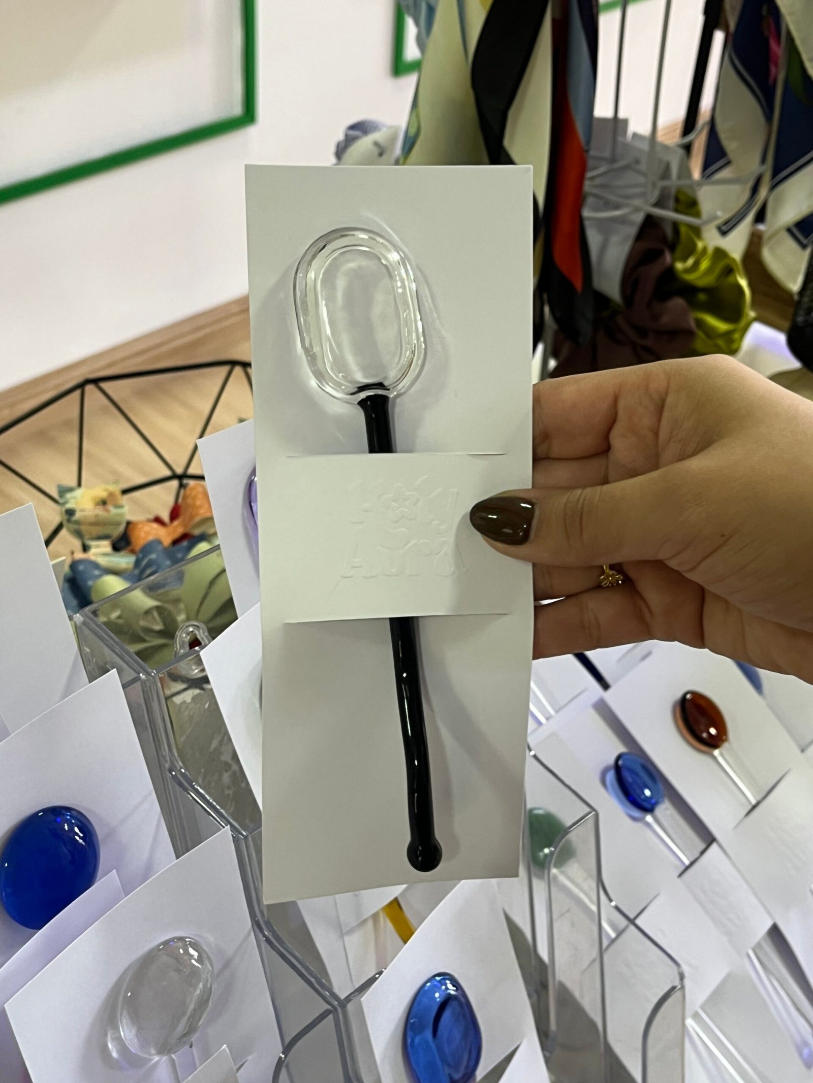 Cuchara de vidrio negro y transparente