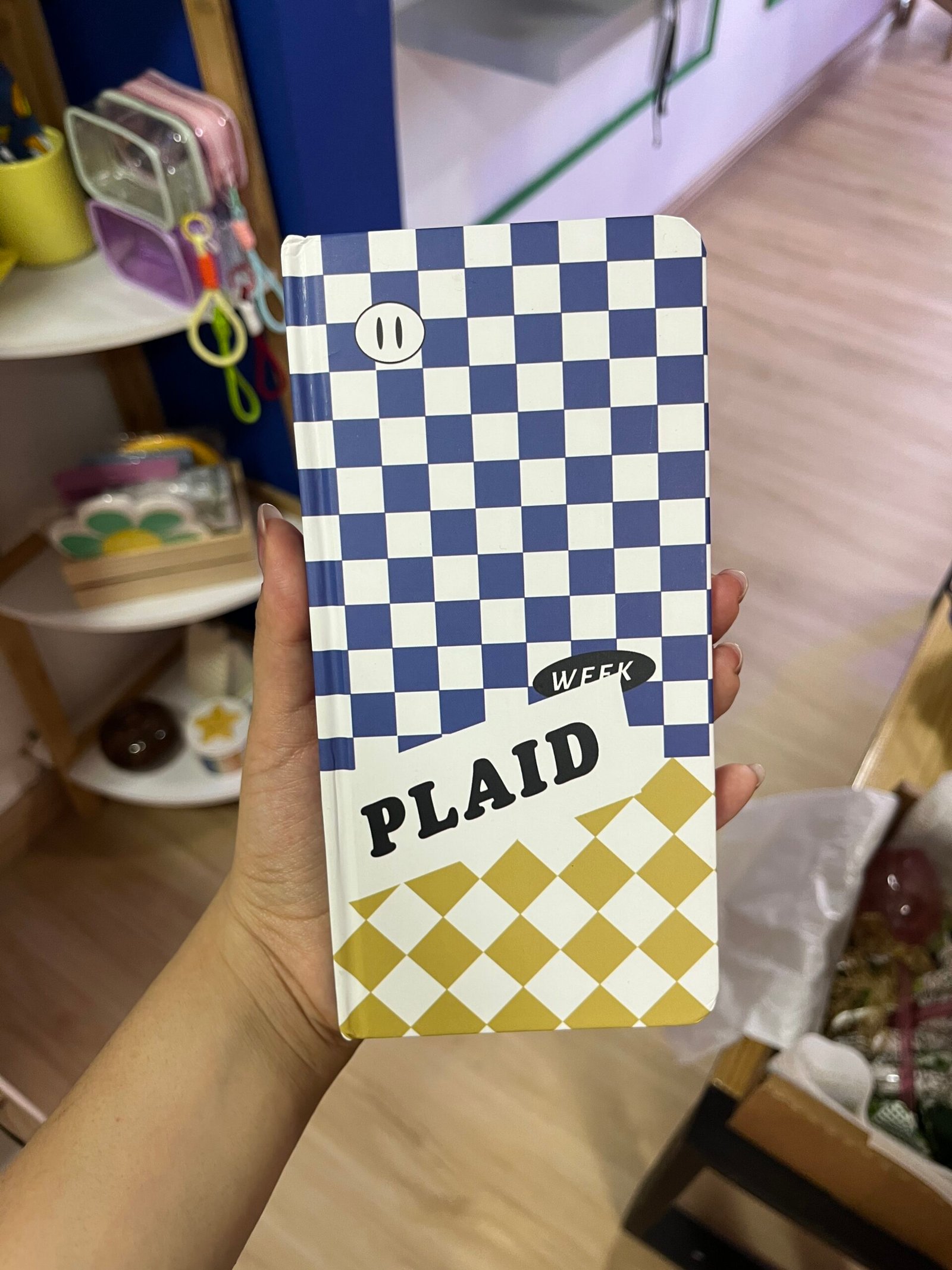 Libreta con hojas cuadriculadas y con diseño cuadrados amarillos y azul