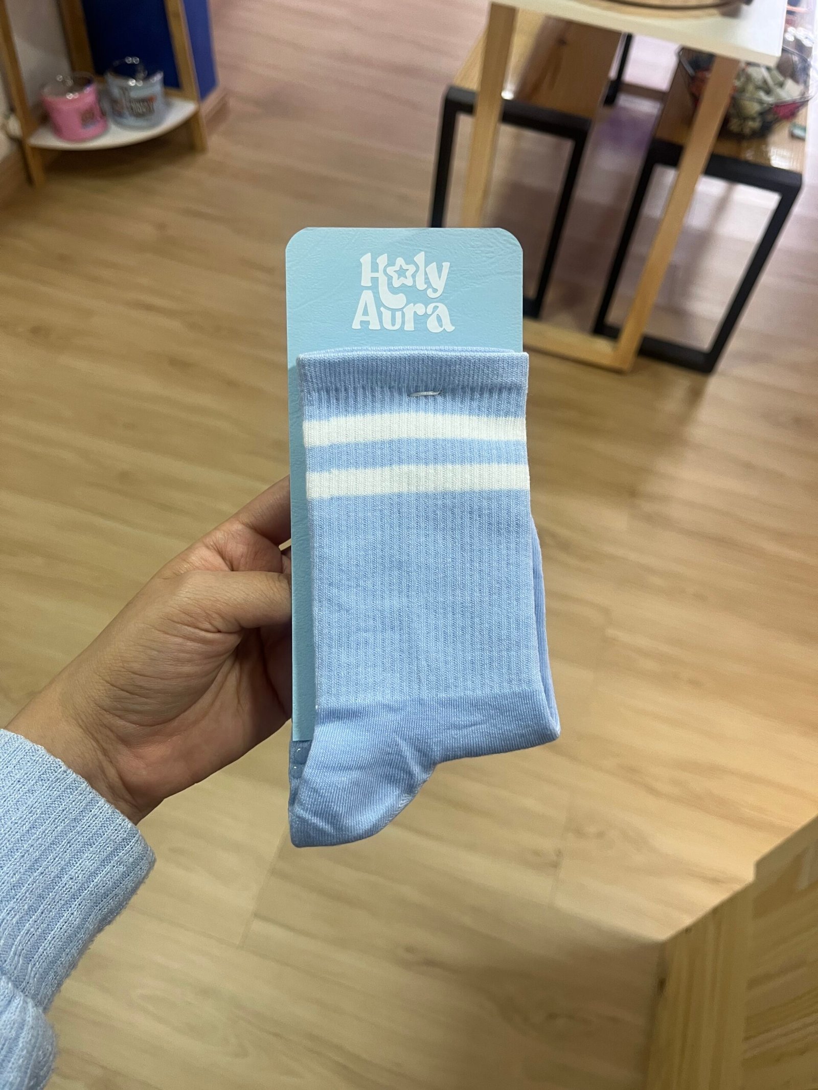 Medias ideales para yoga, pilates, barre, entre otros. color celeste y lineas blancas