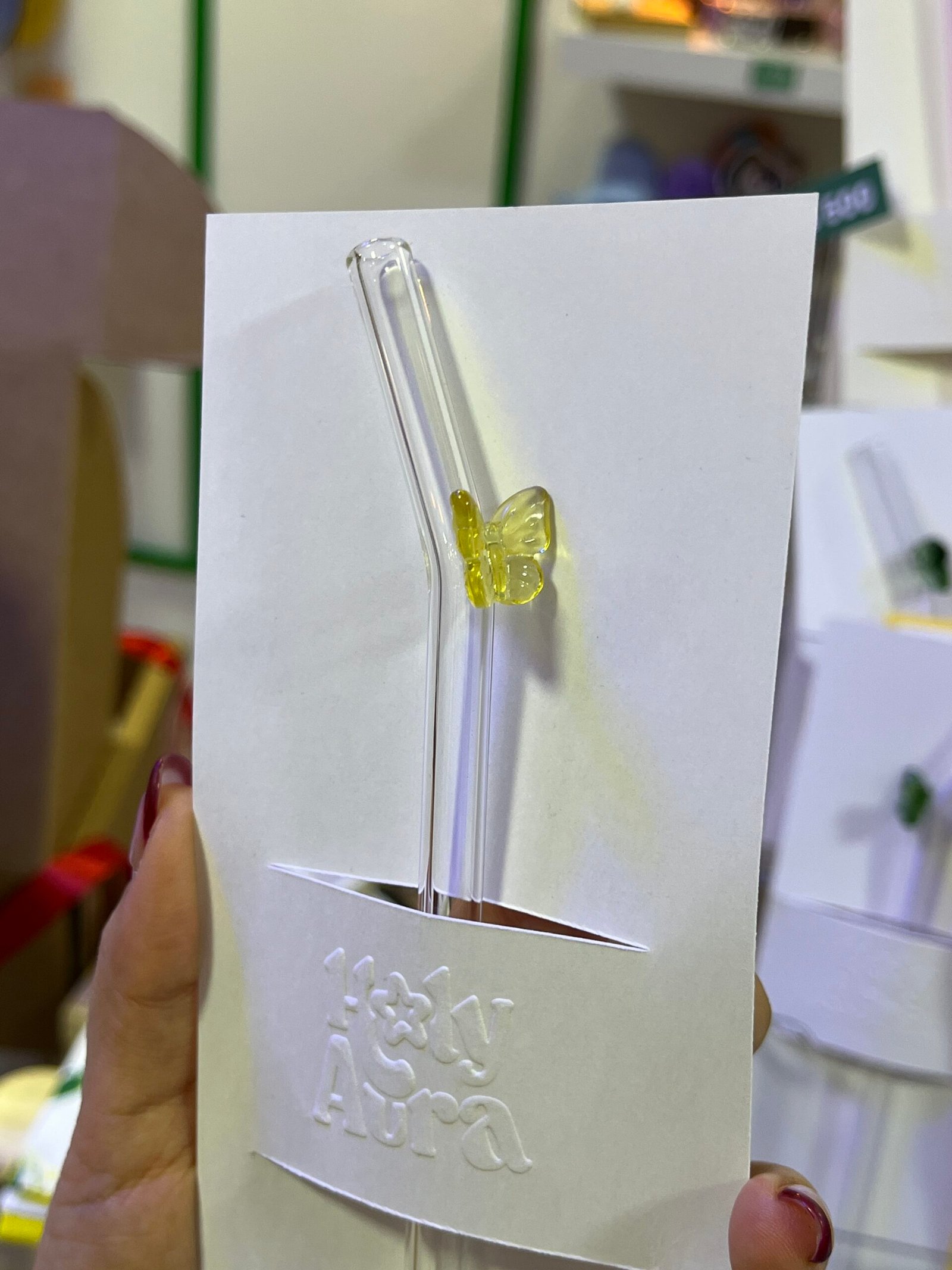 Pajilla reutilizable de vidrio con relieve de mariposa amarilla