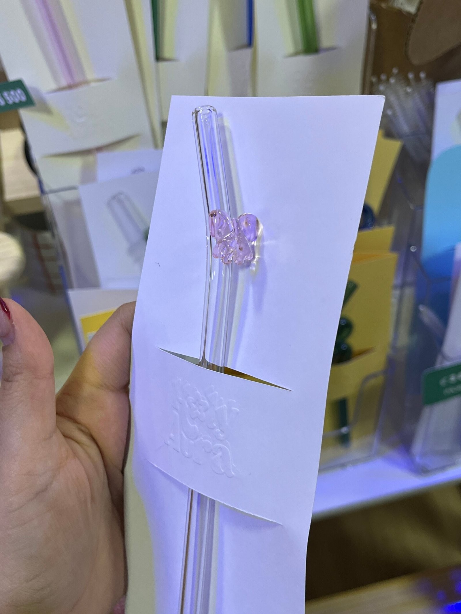 Pajilla reutilizable de vidrio con relieve de lazo color rosado