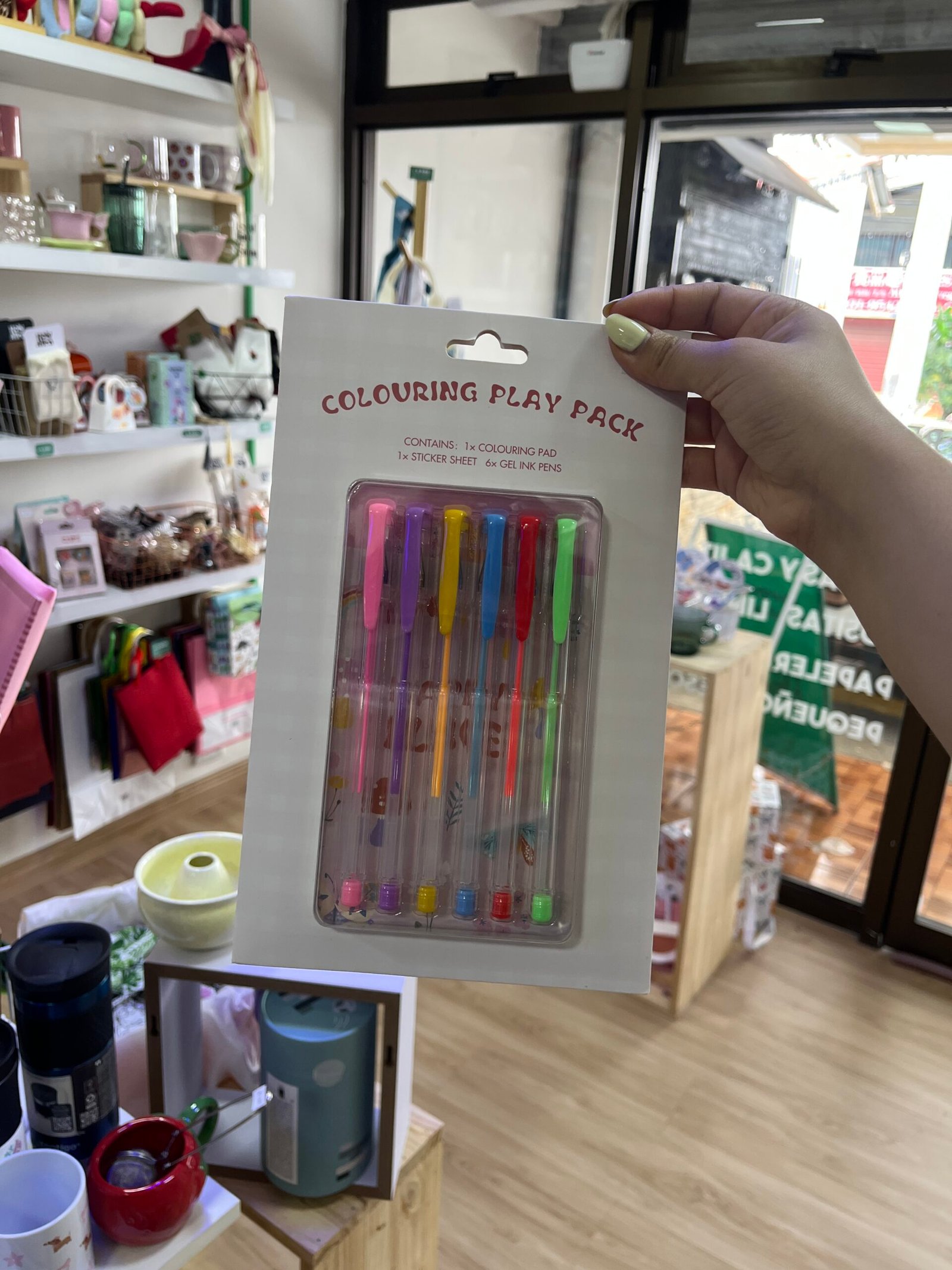 gel ink colores, stickers y cuaderno para pintar