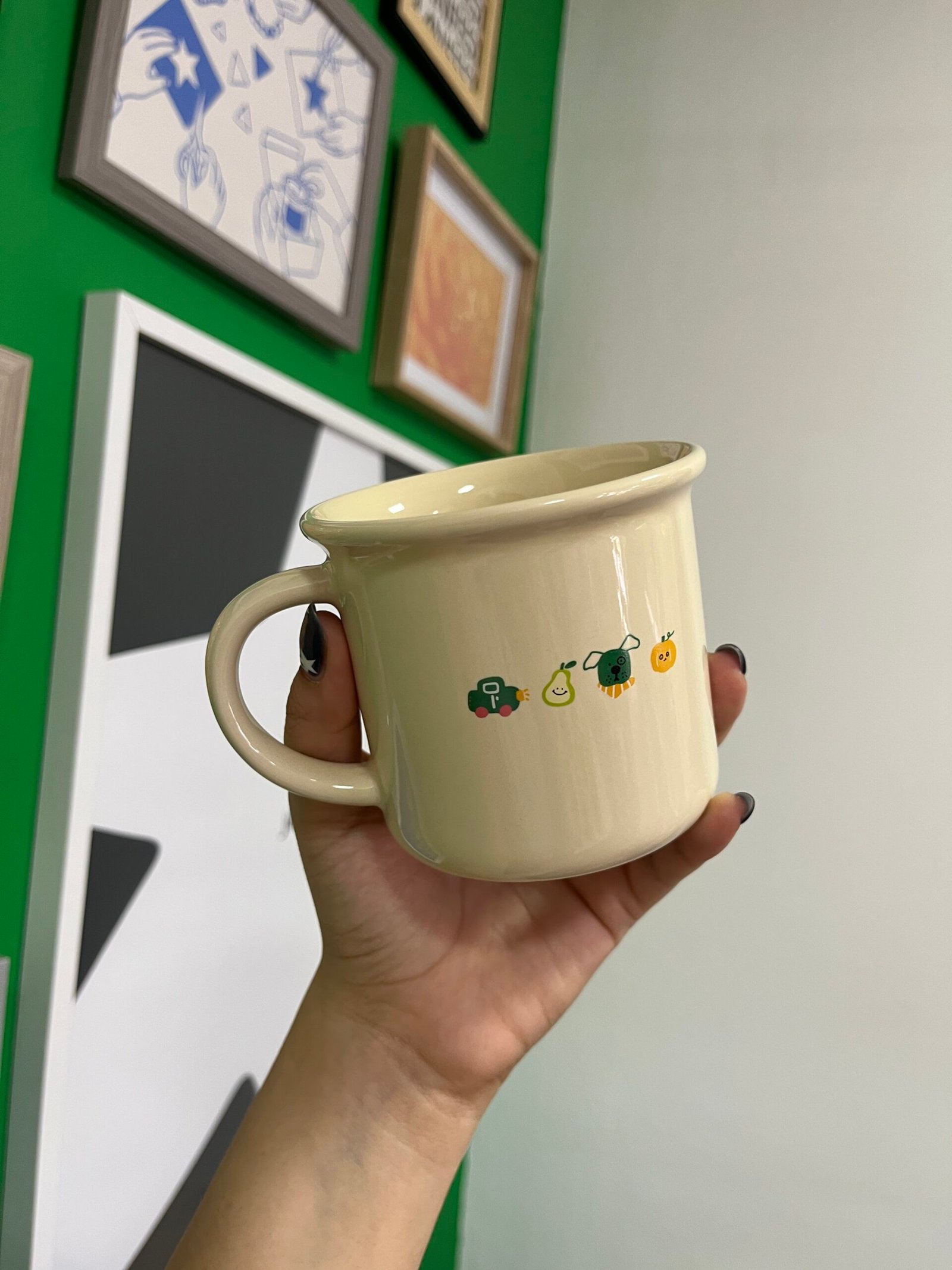 Taza beige con dibujos y palabra ”Coffee”