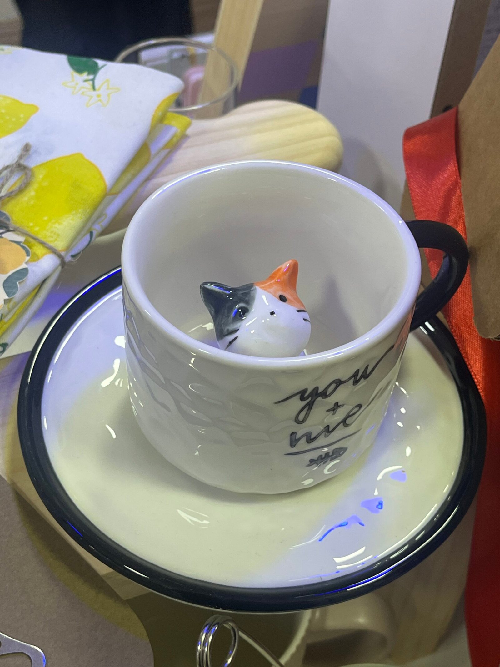 Taza con relieve de gato naranja con negro y plato