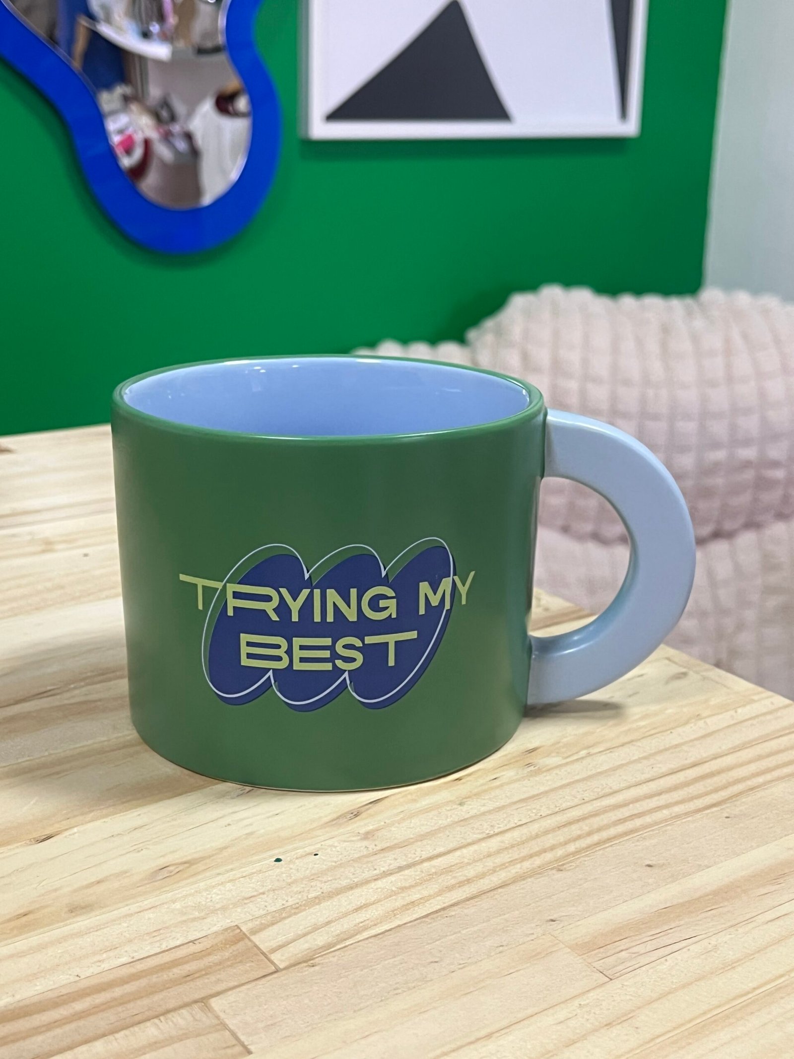Taza verde con celeste y frase ‘trying my best’Taza verde con celeste y frase ‘trying my best’