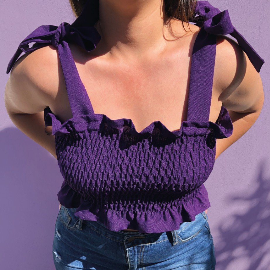 Top fruncidop el?stico morado con tirantes