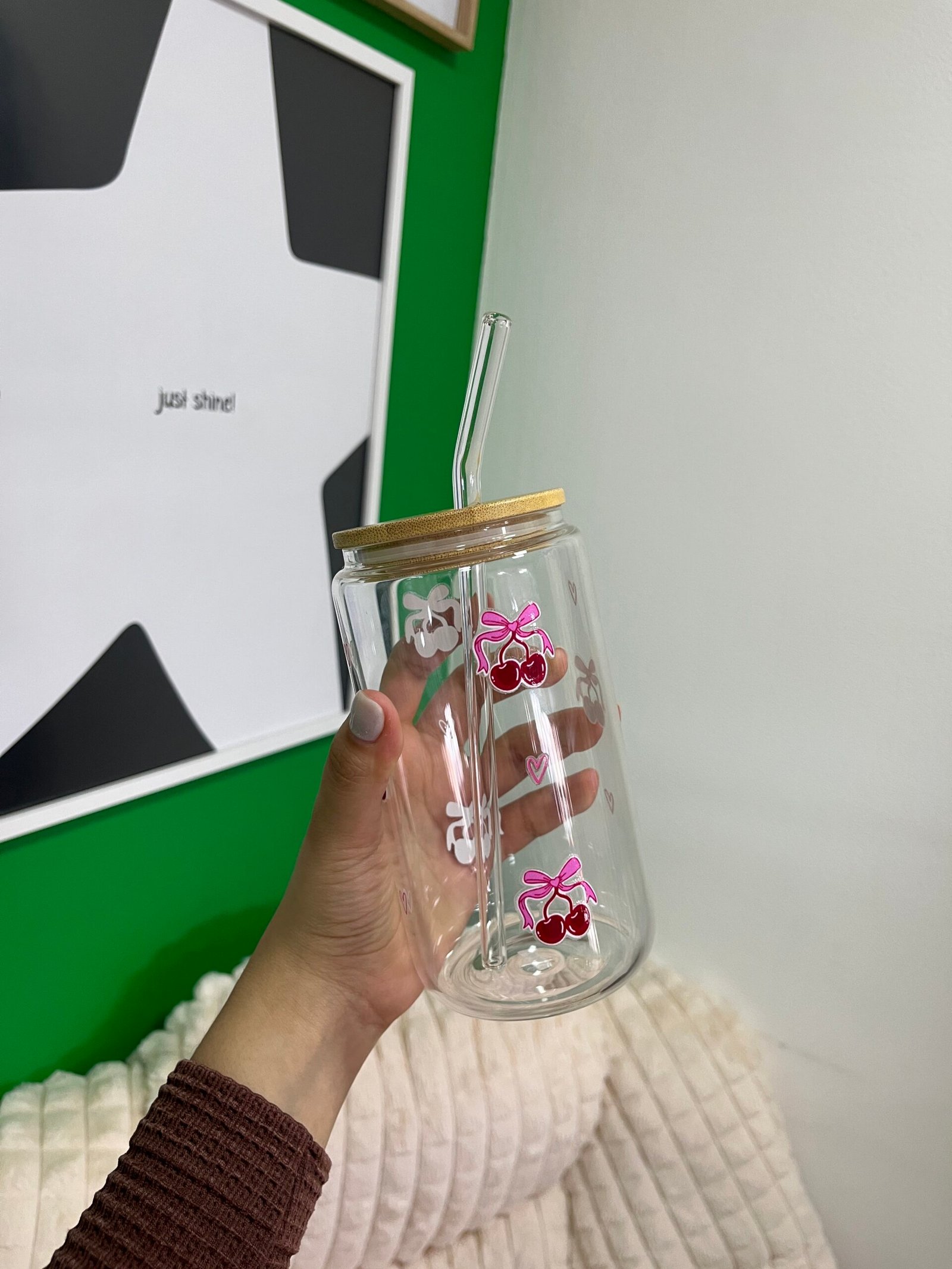 Vaso con pajilla cerezas y corazones