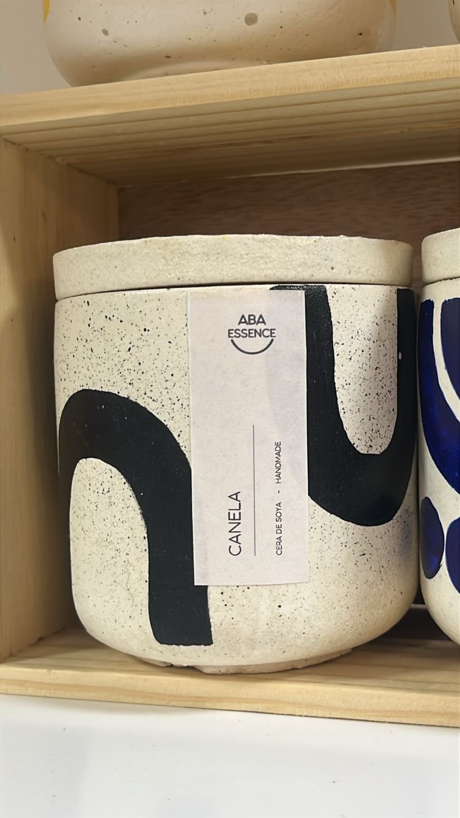 vela fragancia a canela con diseño de formas negras