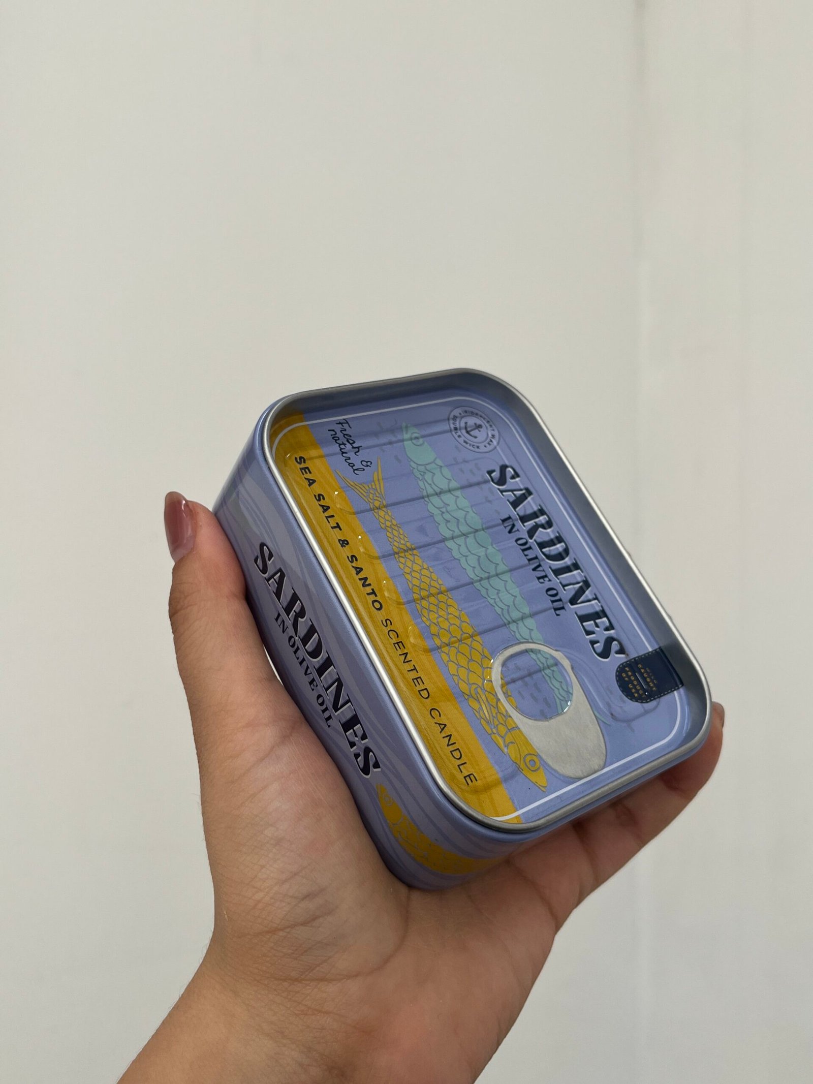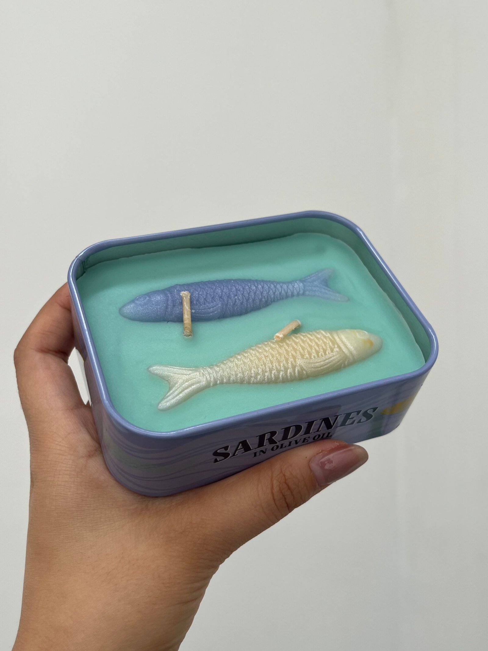 Vela aromática con diseño de lata azul